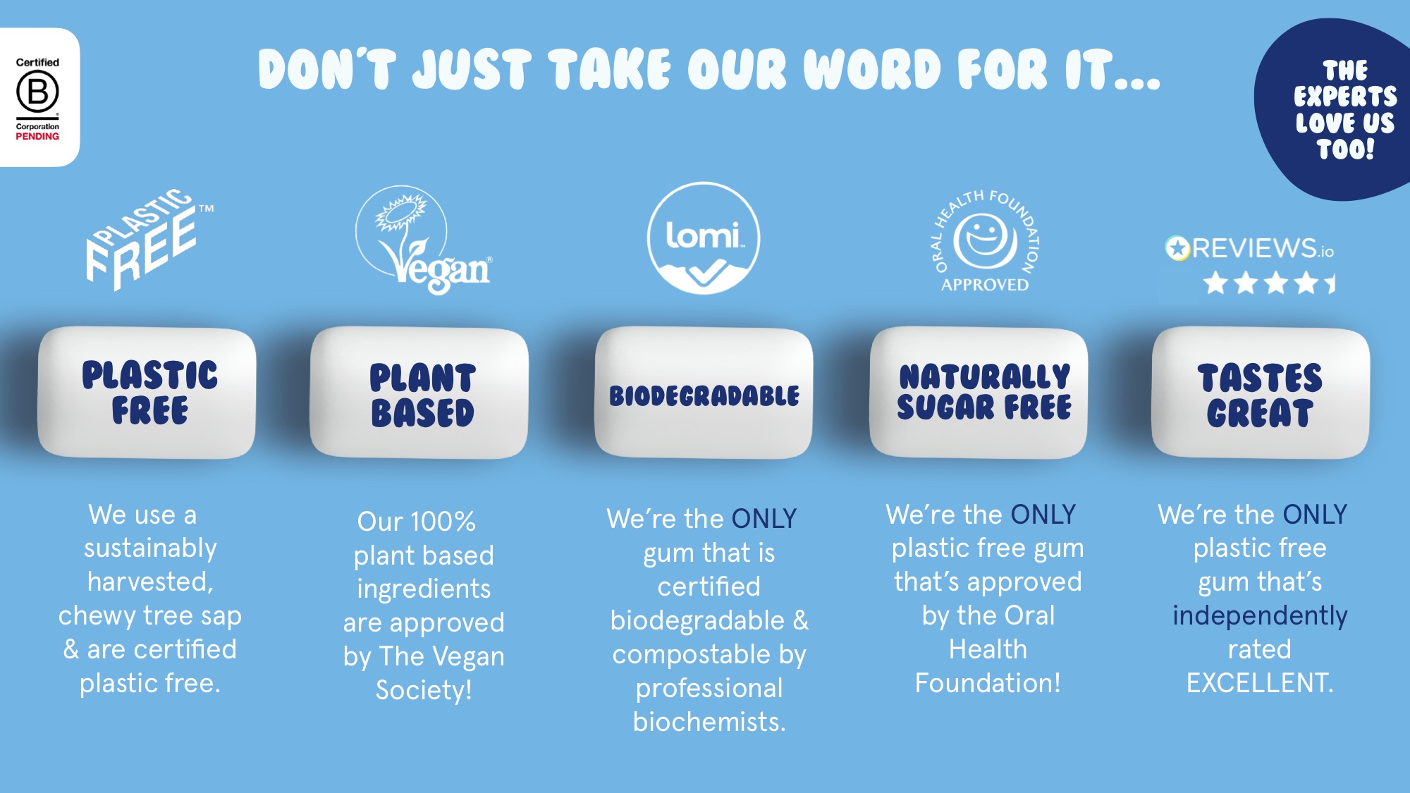 Oral Health Foundation(イギリスに本部を置く口腔健康財団)によって承認された唯一のプラスチックフリーのガムです。